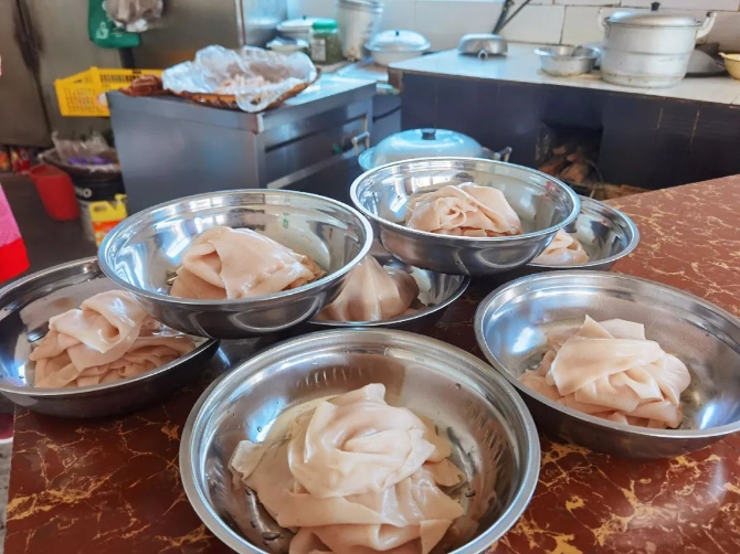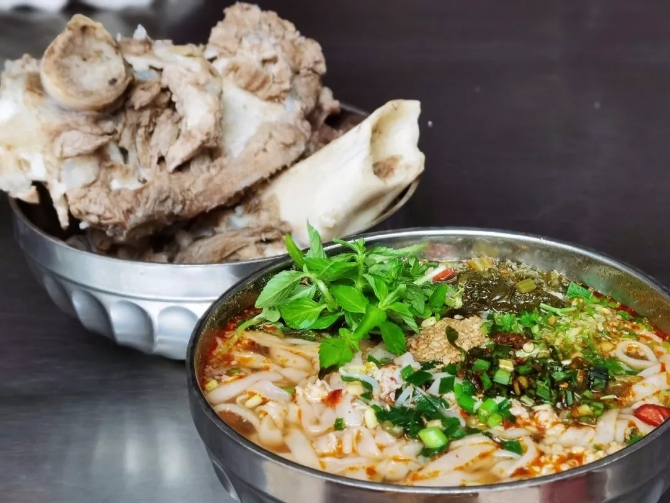 用新鲜猪骨熬制十个小时的汤,十米外就能闻到猪骨的鲜香,让休息一宿的脾胃瞬间醒来,简单的米线,配上这浓骨汤,不知唤起多少普洱人的味觉记忆,这也是人们愿意“不远千里”为它而来的原因吧。(备注:猪骨可以单点,这是重点)