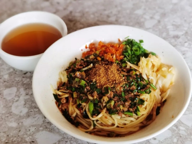 新鲜的挂面作为主料,将猪油放入炒锅烧旺,切末的猪肉、葱、姜、蒜在油锅煸香,加入少许猪骨清汤烧沸,浇在刚出锅的面条上,一碗油然面让人赞不绝口。