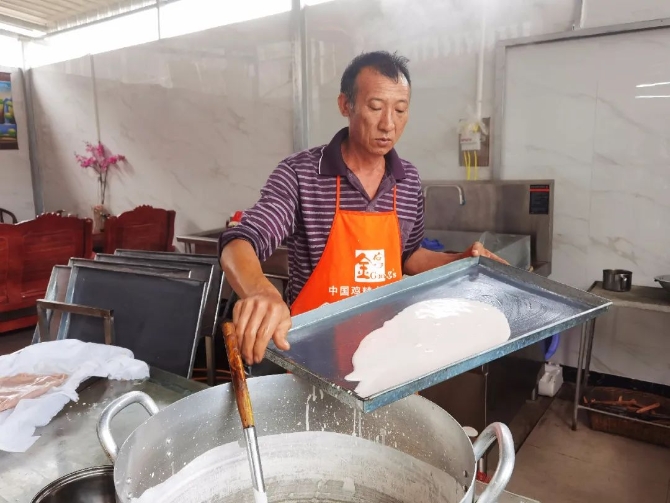 选用上好大米,用清水浸泡两个小时左右,然后把泡好的大米放入磨碎机里磨碎成浆再用清水按比例兑好,将适量米浆放入直径1米的圆形蒸盘内,放入蒸锅一分钟左右抬出, 冷却两三分钟后,沿蒸盘取出,一条米干就做成了,搭配上现磨花生汤和豆汤,尝到的除了美味还有一种“老普洱”情怀。