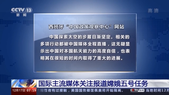 西班牙“中国政策观察中心”网站发表文章说,中国探索太空的步履日渐坚定。相关的多项行动都被中国媒体全程直播,这无疑显示出中国对本国航天能力的高度自信,也表明其在很短的时间内取得了重大的进展。