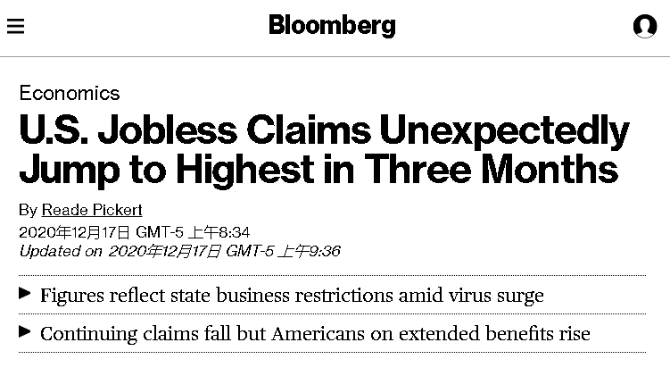 彭博社分析称,美国首次申请各州常规失业救济的人数升至三个月来最高水平,表明在新冠肺炎确诊病例激增和更多商业限制措施出台的情况下,劳动力市场复苏缓慢,预计疫情的持续蔓延及商业限制会对就业条件构成压力,导致就业形势继续恶化。
