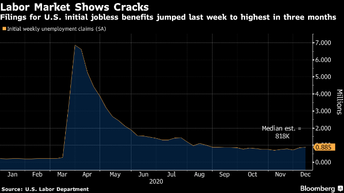 当地时间12月17日,美国劳工部公布数据显示,美国上周首次申请失业救济人数达88.5万人,人数多于市场预期,为三个月来最高水平。这表明在新冠肺炎确诊病例激增和更多商业限制措施出台的情况下,劳动力市场复苏状况正在恶化。与此同时,延宕数月之久的纾困法案谈判也已进入冲刺阶段,尽管共和党和民主党终于展现了妥协的意愿,但由于资金下发存在时滞,即便纾困计划立即获批,但对许多走向“纾困悬崖”的失业者来说,今年年底的圣诞消费季注定无法丰衣足食了。