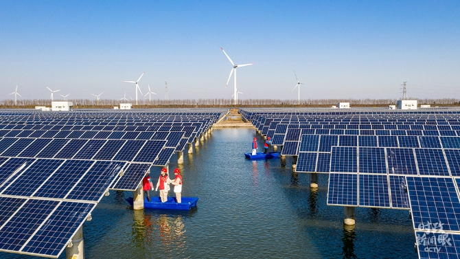 △江苏海安,电力作业人员正在巡检光伏发电设施。