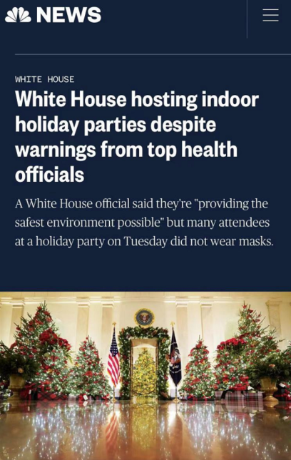 美国全国广播公司报道,节日期间,白宫计划举办多达20场室内聚会