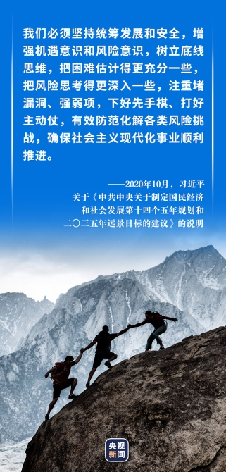 就像在党的十九届五中全会上,习近平所作的关于《中共中央关于制定国民经济和社会发展第十四个五年规划和二〇三五年远景目标的建议》的说明中说的那样:“我们越来越深刻地认识到,安全是发展的前提,发展是安全的保障。”