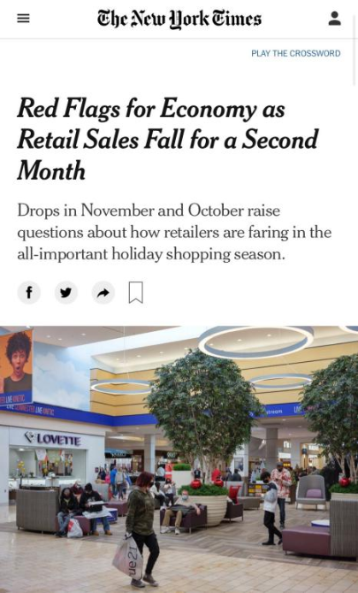 △《纽约时报》报道,美国11月零售额下滑1.1%,为经济复苏敲响警钟