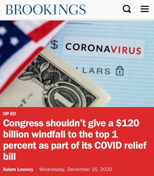 △布鲁金斯学会认为,美国国会即将出台的新一轮纾困措施,可能包含1200亿美元送给富人的“礼物”