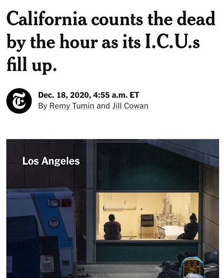 △《纽约时报》报道,加州洛杉矶县平均每小时有2人死于新冠肺炎,每80人中有1人被感染