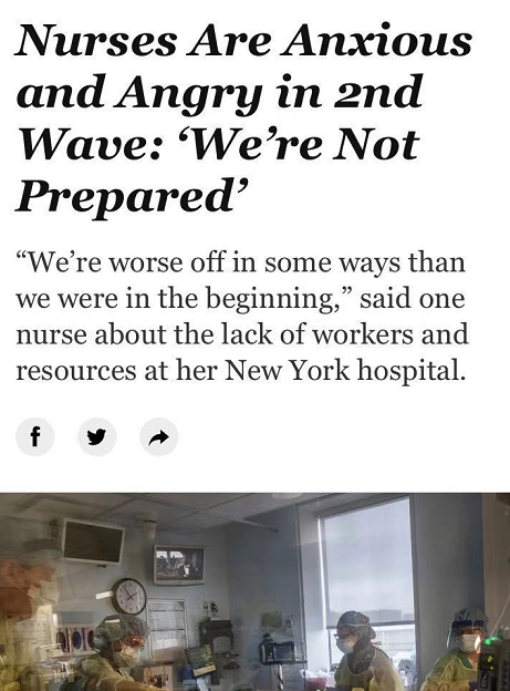 纽约州护士告诉《纽约时报》:“我们需要人手,我们需要帮助,我们需要资源。我担心自己的病人,也担心将发生和3月份相同的事情。现在疫情再次暴发,但我们仍然没有做好准备。”
