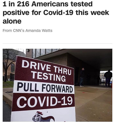 △CNN指出,过去一周,报告统计全国新增151万病例,这意味着最近七天内,平均每216个美国人中就有1人确诊