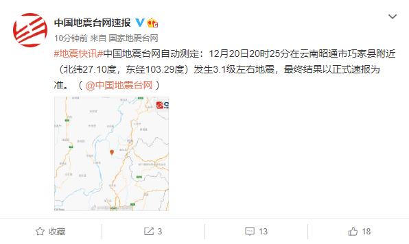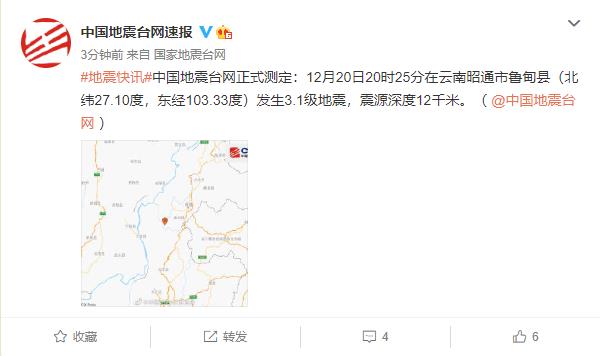昭通市鲁甸县发生3.1级地震 震源深度12千米