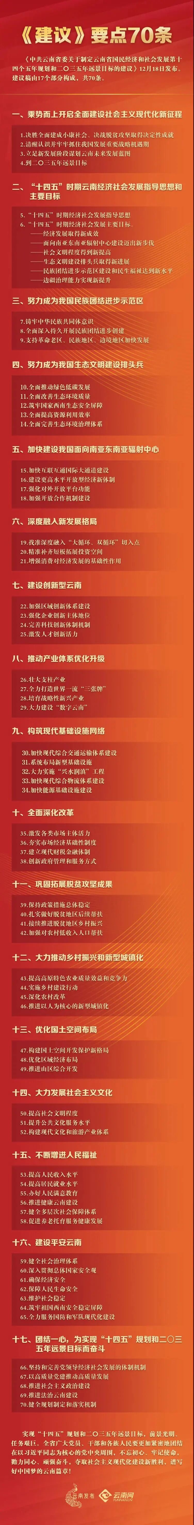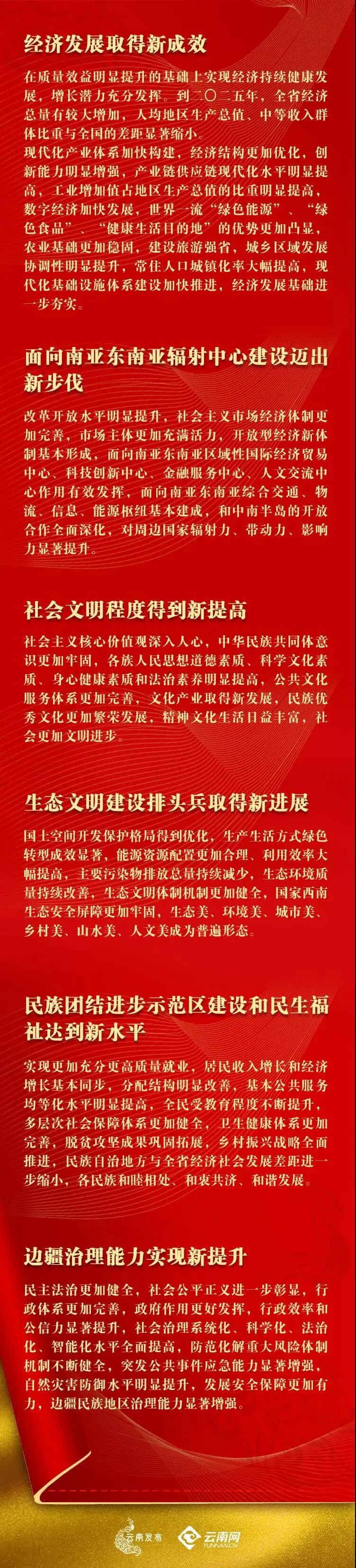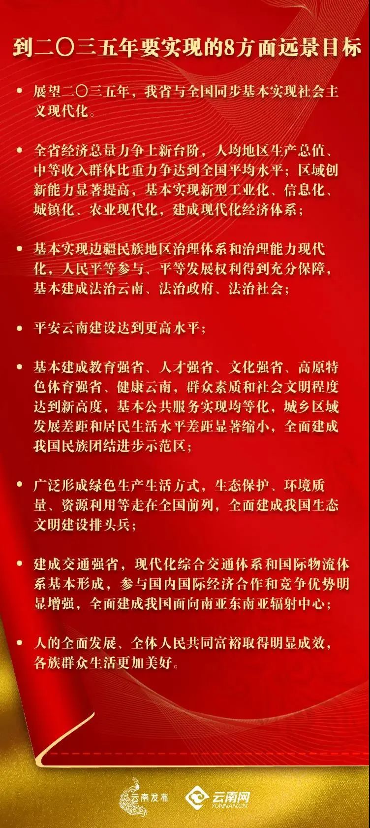 《建议》科学分析了云南面临的形势,强调要立足新发展阶段谋划云南未来发展蓝图,提出了到二〇三五年云南与全国同步基本实现社会主义现代化的8个方面奋斗目标: