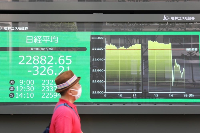 8月28日,日本东京街头的一处电子股指显示屏显示,下午14时左右,受时任日本首相安倍晋三或因健康原因辞职影响,股市指数急速下跌。新华社记者 杜潇逸 摄