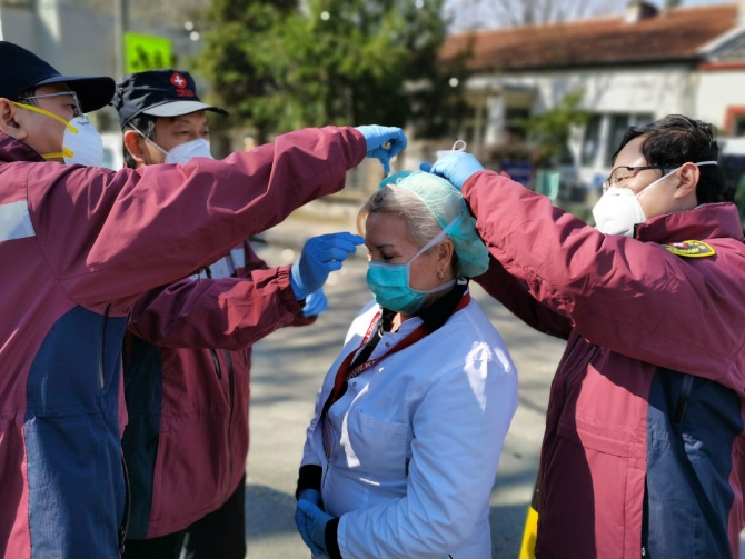4月4日,中国赴塞尔维亚抗疫医疗专家组在贝尔格莱德的基层发热门诊走访时,帮助塞尔维亚医生特里富诺维奇(中)佩戴高标准的防护口罩。新华社发