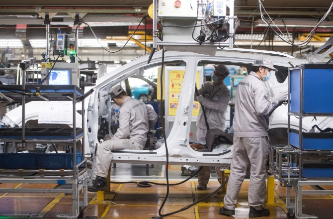 3月24日,工人在湖北武汉东风乘用车公司工厂总装车间的流水线上作业。3月下旬左右,武汉各企业开始陆续复工复产。新华社记者 肖艺九 摄