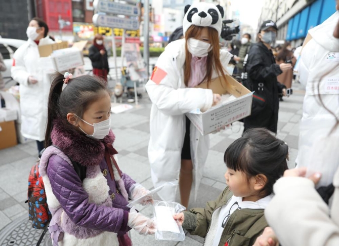 2月29日,在日本东京的池袋站前,在日华侨华人志愿者团体“口罩熊猫行动小组”向当地民众免费发放口罩,一名小志愿者(左)将儿童用口罩送给日本小朋友。新华社记者 杜潇逸 摄