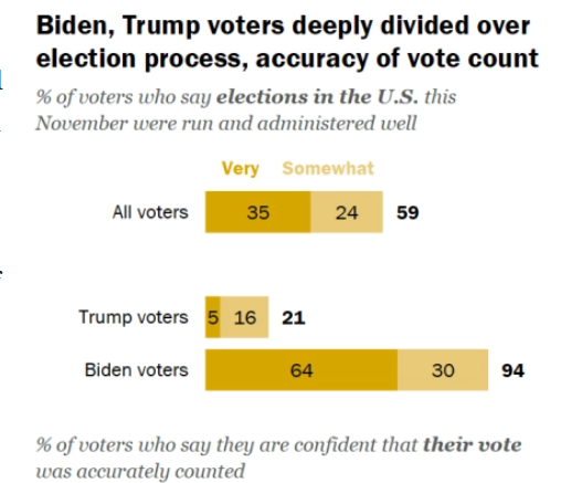 △皮尤研究中心对特朗普和拜登选民的调查显示,特朗普的支持者中仅有21%认为竞选中不存在“舞弊”,而拜登支持者中这一数据高达94%。