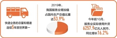 “十三五”以来,我国服务业比重进一步提高,生产性服务业加速迈向专业化,生活性服务业不断向高品质延伸,优质高效的服务业助推产业改造升级,提升百姓生活品质。2019年,我国服务业增加值占国内生产总值比重达53.9%,比2015年提高3.4个百分点,成为推动经济增长的主动力。