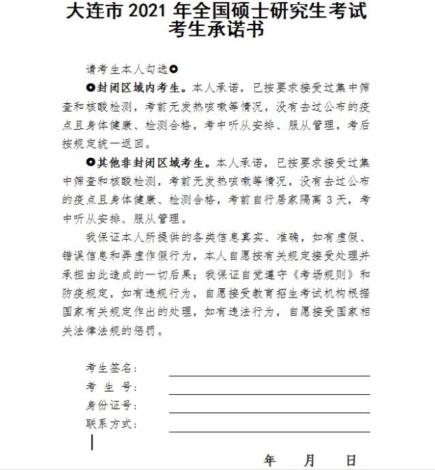 (二)其他考点考生。考生须于考前7天内接受2次新冠肺炎病毒核酸检测(含1次集中筛查)。考生须持《准考证》、《居民身份证》、考前7天内新冠肺炎病毒核酸检测阴性报告及“辽事通健康通行码”绿码,经测温合格后方可进入考点。同时,非封闭区域内考生还须提交《本人承诺书》,承诺本人考前无发热咳嗽等情况,没有去过公布的疫点且身体健康、检测合格,考前自行居家隔离3天,考中听从安排、服从管理。
