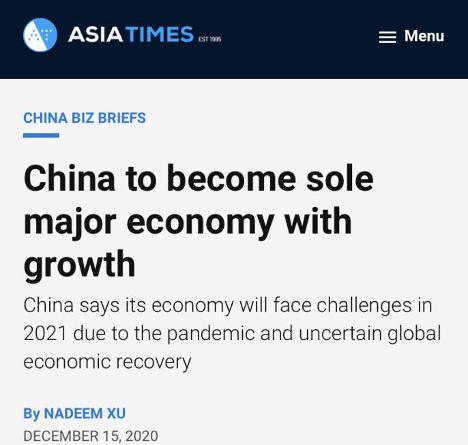 中国,是2020年全球 唯一 实现经济正增长的主要经济体。
