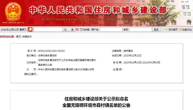 近日,住房和城乡建设部公示了拟命名全国无障碍环境市县村镇名单。