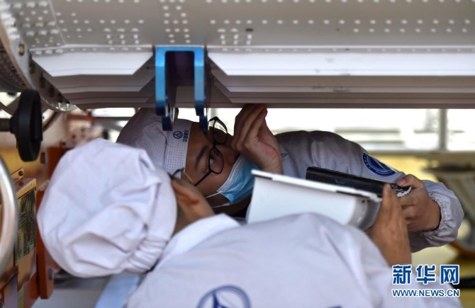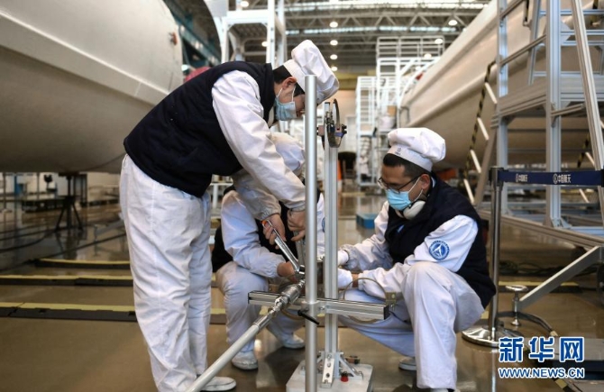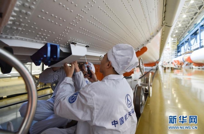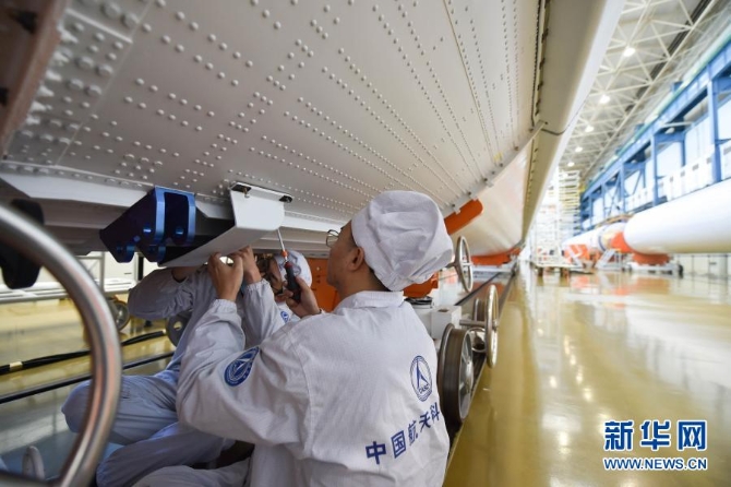 在中国航天科技集团一院天津大运载基地长征五号运载火箭总装车间,工作人员进行相关测试工作(资料照片)。新华社发(孙凡越 摄)