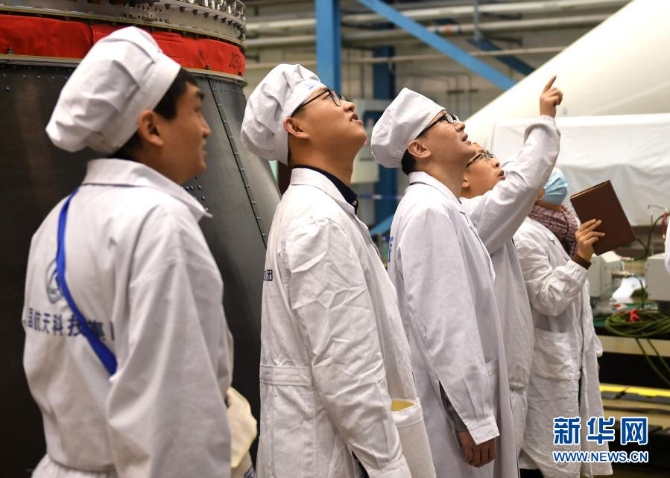 工作人员在中国航天科技集团一院天津大运载基地长征五号运载火箭总装车间内交流(资料照片)。新华社发(赵子硕 摄)