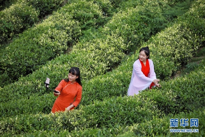 4月30日,网络主播毛华艳(右)在贵州省余庆县白泥镇春景村郊外的茶园直播,助推山区茶叶销售。新华社记者 刘续 摄