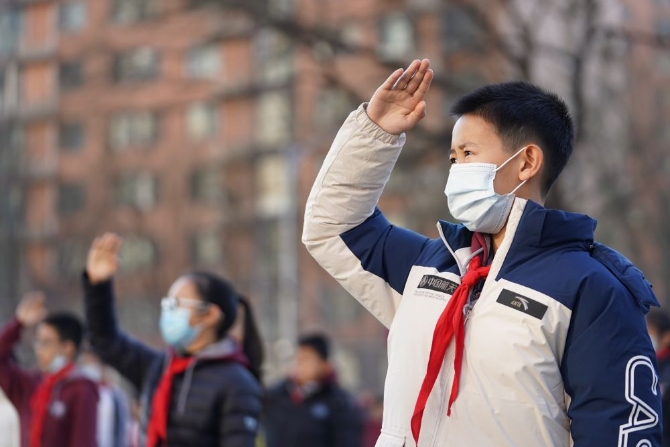 12月21日,在北京四中广外校区,蔡昊霖(前)和同学一起参加升旗仪式。