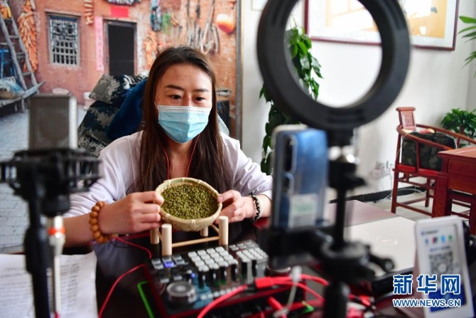 12月13日,甘肃省庆阳市环县大学生孟静通过电商平台介绍家乡的土特产。新华社记者 陈斌 摄