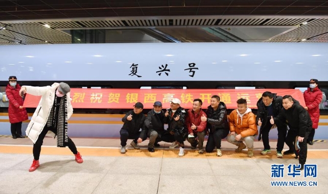 12月26日,乘客在西安北站与担负银西高铁运输任务的“复兴号”动车组合影。新华社记者 张博文 摄