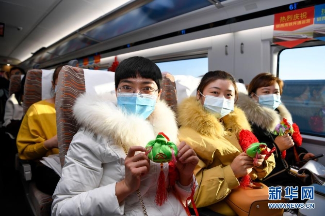 12月26日,乘坐由银川开往西安北的D4385次列车的乘客展示获赠的庆阳香包。新华社记者 冯开华 摄