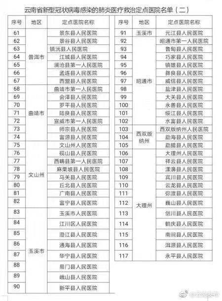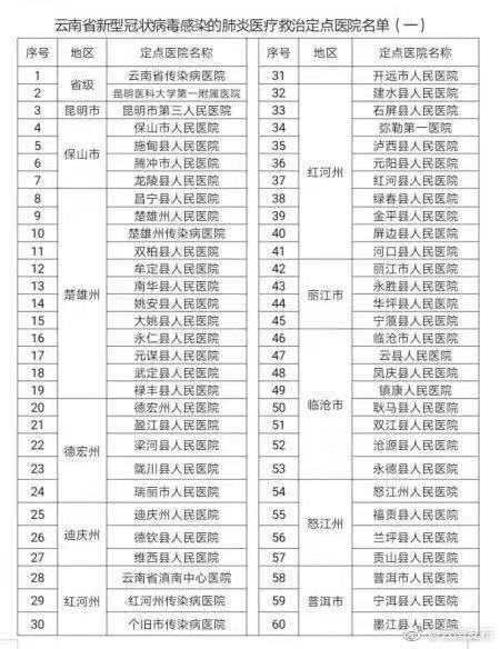四、身体不适及时就医。目前,云南省已确定200家发热门诊和117家救治定点医院(具体名单附后)。如您身体出现发热、乏力、干咳、胸闷或呼吸困难等症状,请尽快到定点医疗机构就诊。