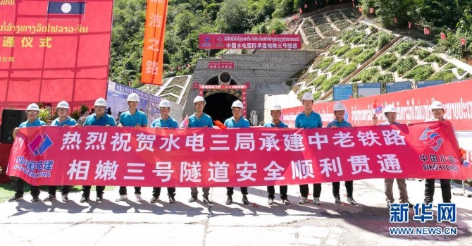 这是9月29日在老挝北部琅勃拉邦省拍摄的相嫩三号隧道贯通仪式现场。新华社发(凯乔摄)