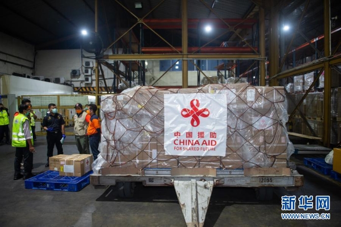 3月26日,中国援助印度尼西亚的首批抗疫物资停放在雅加达苏加诺哈达机场仓库。新华社记者 杜宇 摄