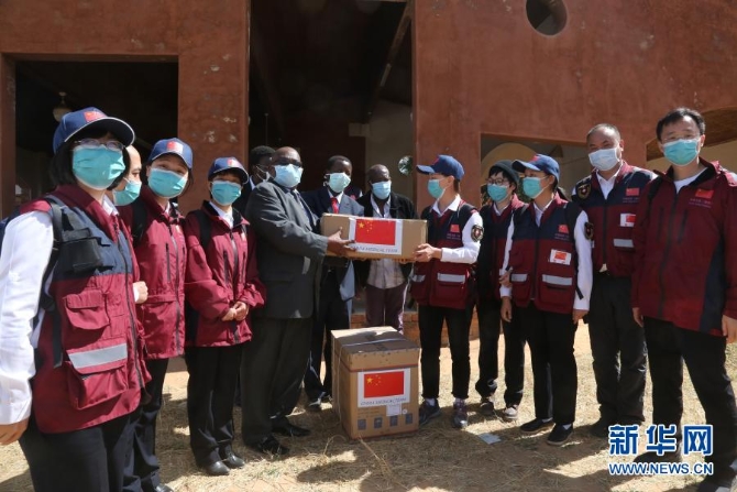 5月19日,在津巴布韦中马绍纳兰省的姆武尔维医院,中国抗疫医疗专家组为当地医疗机构捐赠医疗物资。新华社记者 张玉亮 摄