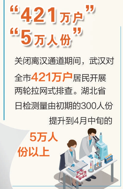 关闭离汉通道期间,武汉对全市421万户居民集中开展两轮拉网式排查。同时,湖北省日检测量由疫情初期的300人份提升到4月中旬的5万人份以上。