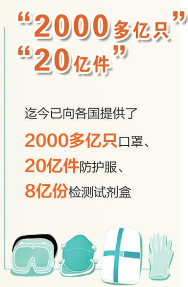 在满足国内疫情防控需要的基础上,中国想方设法为各国采购防疫物资提供力所能及的支持和便利,向150多个国家和9个国际组织提供抗疫援助,为有需要的34个国家派出36支医疗专家组;保质保量向国际社会提供抗击疫情急需的防疫物资,迄今已向各国提供了2000多亿只口罩、20亿件防护服、8亿份检测试剂盒;积极推进药物、疫苗研发合作和国际联防联控,加强全球公共卫生治理,推动构建人类卫生健康共同体。