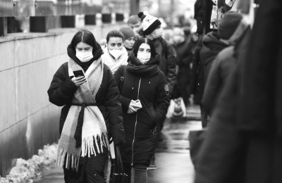12月24日,在乌克兰基辅,戴口罩的人们排队候车。 新华社发