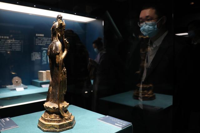12月28日,参观者在航海文物展上的一尊鎏金佛像展柜前驻足观看。