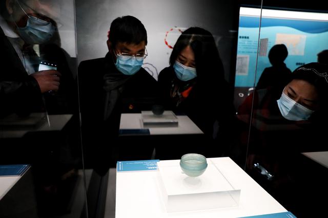12月28日,参观者在航海文物展上的西汉弦纹玻璃杯展柜前驻足观看。