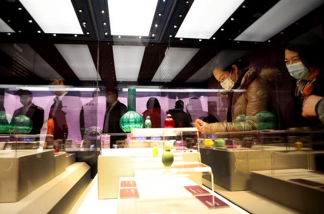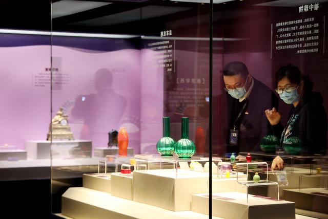 12月28日,参观者在航海文物展上的一组琉璃制品展柜前驻足观看。