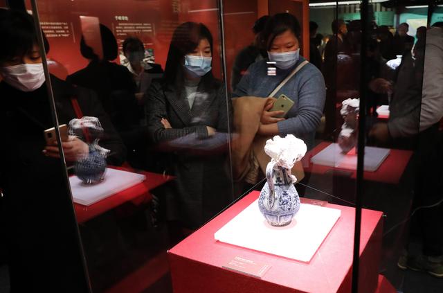 12月28日,参观者在航海文物展上的一个元青花瓷瓶展柜前驻足观看。