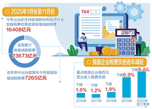 2020年即将结束,《政府工作报告》提出的“预计全年为企业新增减负超过2.5万亿元”的任务目标能完成吗?国家税务总局发布的最新数据显示,今年1月份至11月份,全国累计新增减税降费23673亿元。专家认为,从最新数据看,全年减负2.5万亿元的任务目标预期可完成。