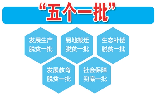 中央明确提出,打赢脱贫攻坚战要按照贫困地区和贫困人口的具体情况,实施“五个一批”工程,即:发展生产脱贫一批,易地搬迁脱贫一批,生态补偿脱贫一批,发展教育脱贫一批,社会保障兜底一批。