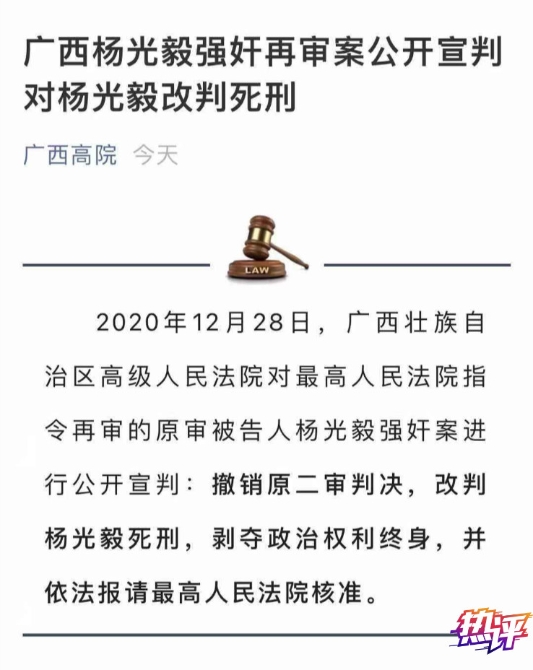 12月28日,广西壮族自治区高级人民法院对最高人民法院指令再审的原审被告人杨光毅强奸案进行公开宣判:撤销原二审判决,改判杨光毅死刑,剥夺政治权利终身,并依法报请最高人民法院核准。