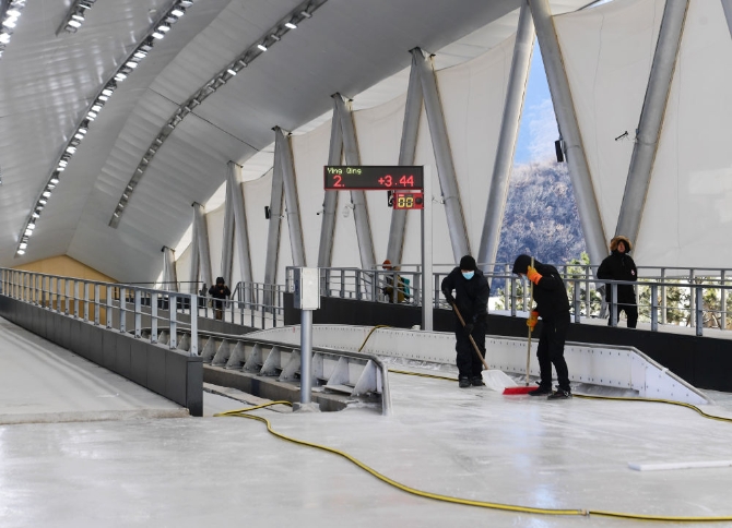 ↑12月29日,工作人员在国家雪车雪橇中心清理冰面。