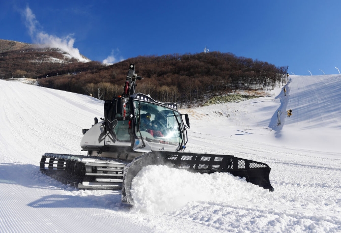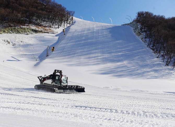 ↑12月29日,工作人员在国家高山滑雪中心雪道上操作压雪车。