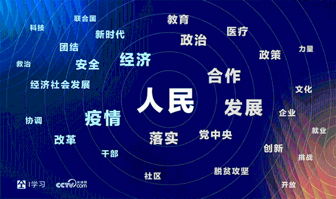 央视网I学习数据库利用人工智能技术对总书记2020年讲话高频词进行分析,高居前三位的是“人民”“发展”“疫情”。