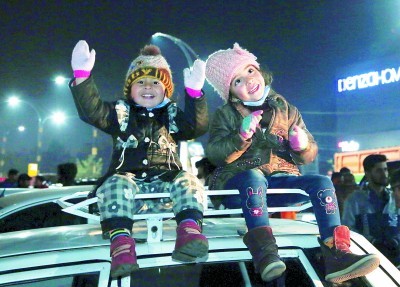1月1日,两名儿童在巴基斯坦拉瓦尔品第的新年庆祝活动上照相。新华社发